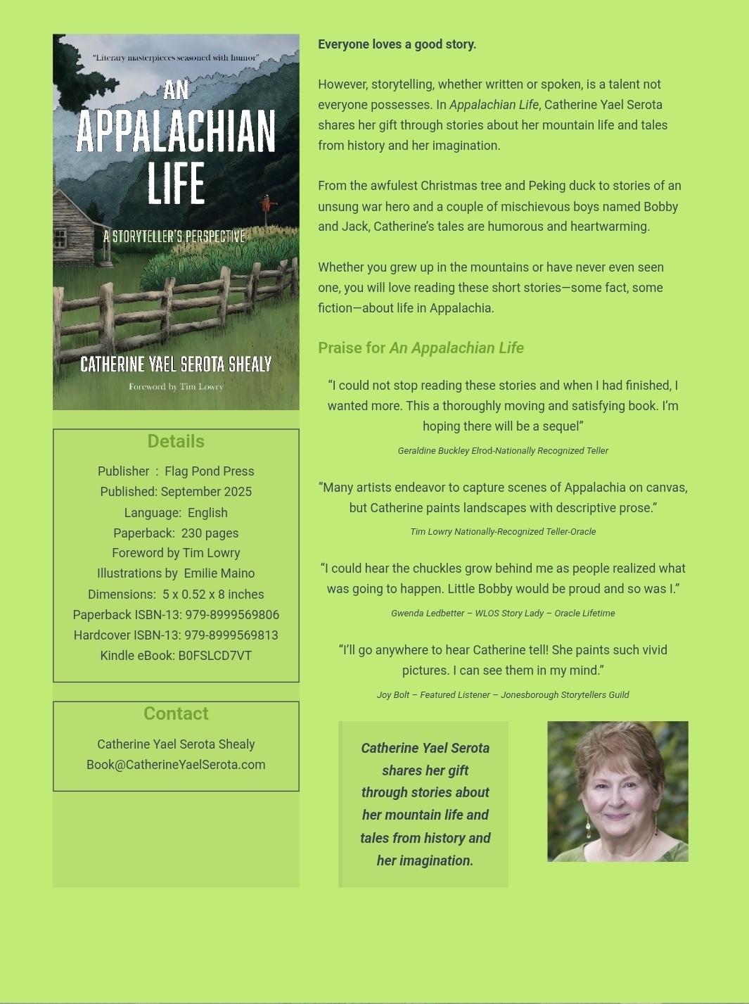 However, storytelling, whether written or spoken, is a talent not everyone possesses. In Appalachian Life, Catherine Yael Serota shares her gift through stories about her mountain life and tales from history and her imagination.